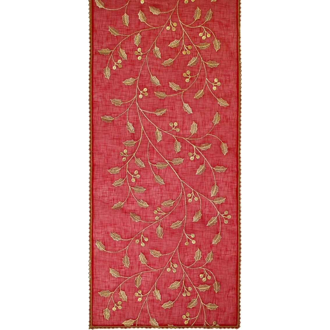 The Avanti Allover Leaf 16 x 120 in. Runner is beautifully decorated with an embroidered gold holly leaf, berry and vine design that runs end-to-end. The border is edged with a coordinating gold scallop on all four sides. Made of 100% polyester for easy care. Model: 41581-120RN RED.