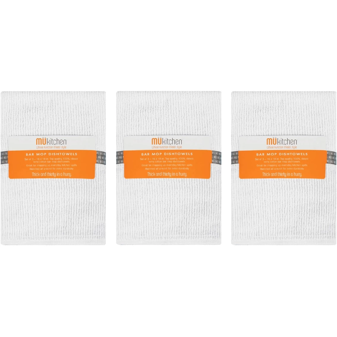 MUkitchen offers pro-grade function in a lightweight terry dish towel, providing texture and softness with extra absorbency for the toughest spills. This 4-pack of bar towels contains 3 towels per pack. Each is crafted from 100% ribbed terry cotton and measures 16 in. x 18 in. Model: 36620.