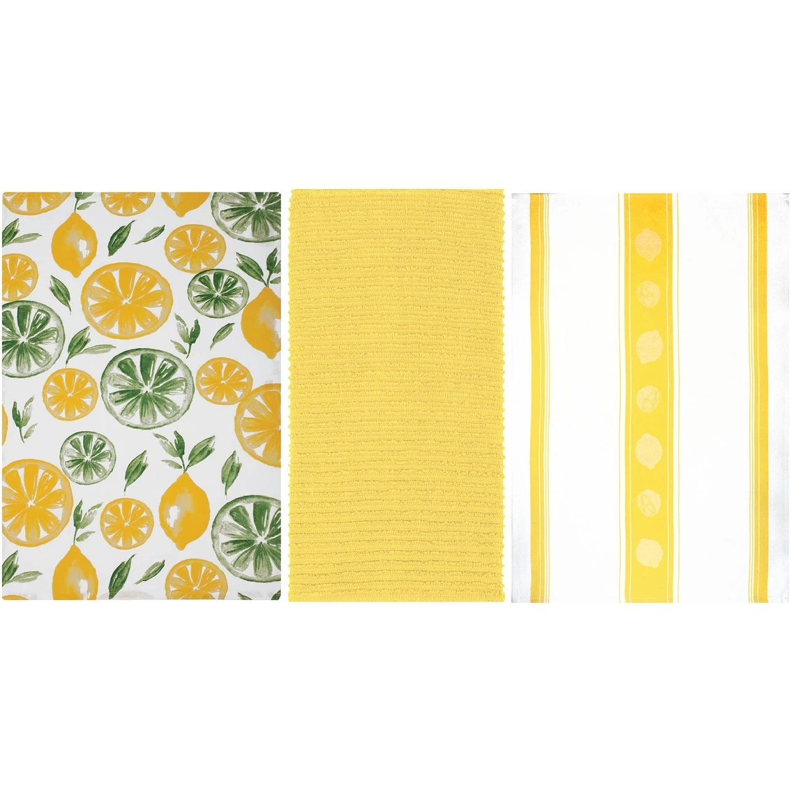 Featuring designer prints, this set of three towels from MUkitchen are soft and absorbent. They include a hanging loop for convenience. These cheery towels feature lemon-lime and sunburst patterns that are sure to brighten your kitchen. Model: 6630-2063.