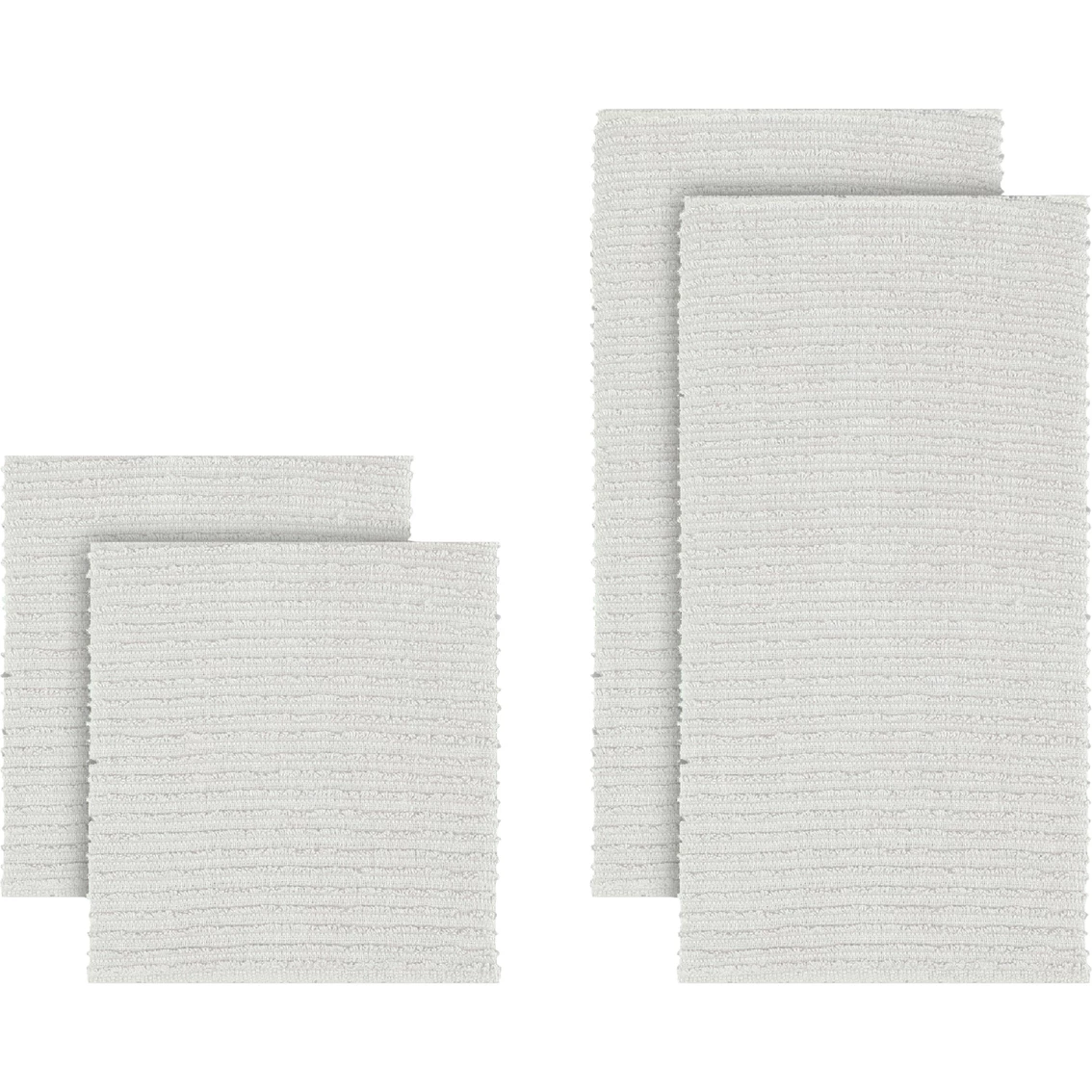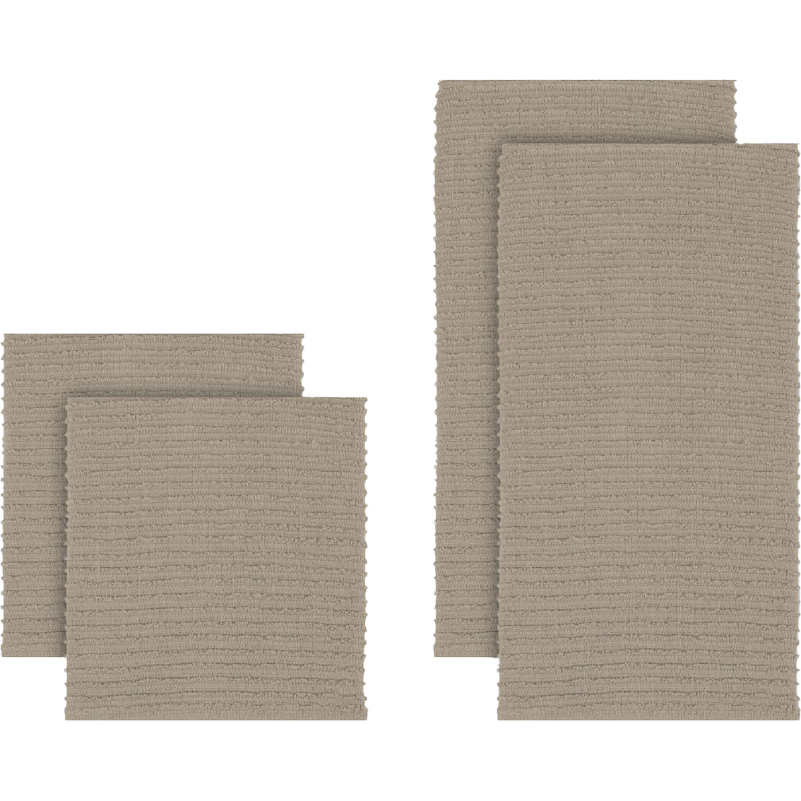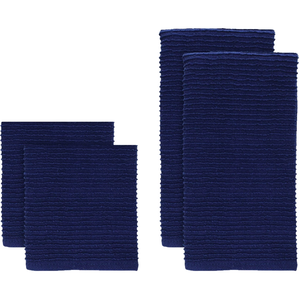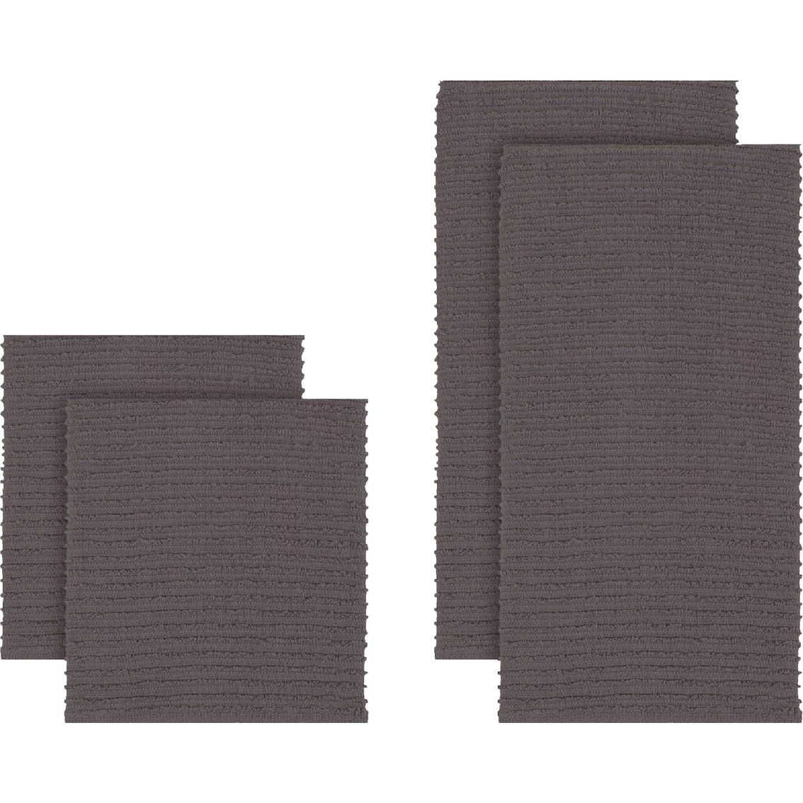 This four-piece set from MUkitchen includes two kitchen towels and two dish cloths designed with a ridged terry texture that aids in better absorbency. A hanging loop is included for convenience. These towels come in a variety of color options, making it easy to find something that matches your decor. Model: 46145.