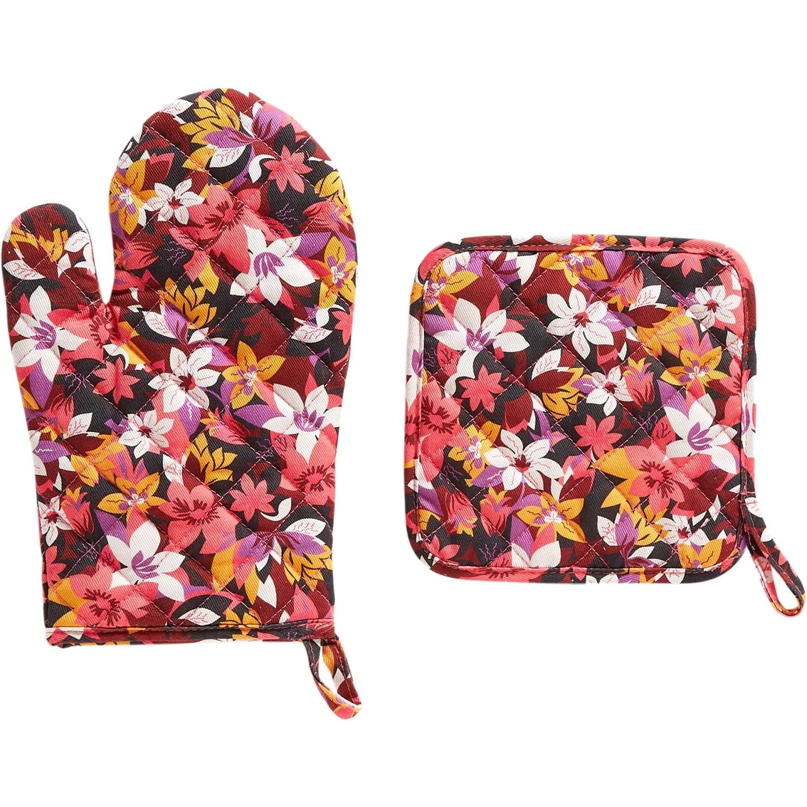 The chef is always right — look the part with this pot holder and oven mitt. Adding a delightful pretty pattern to your cooking and baking, this Vera Bradley set is crafted from soft, quilted cotton fabric that washes well for easy clean up. Thick padding between the fabric keeps your hands cool. Rosa Floral. Model: 28369X50.